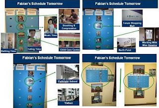 Wall schedule- we had modified and align to new IEP goals & objectives and also lower the schedule board to let him interact as he transit to his next activity area.